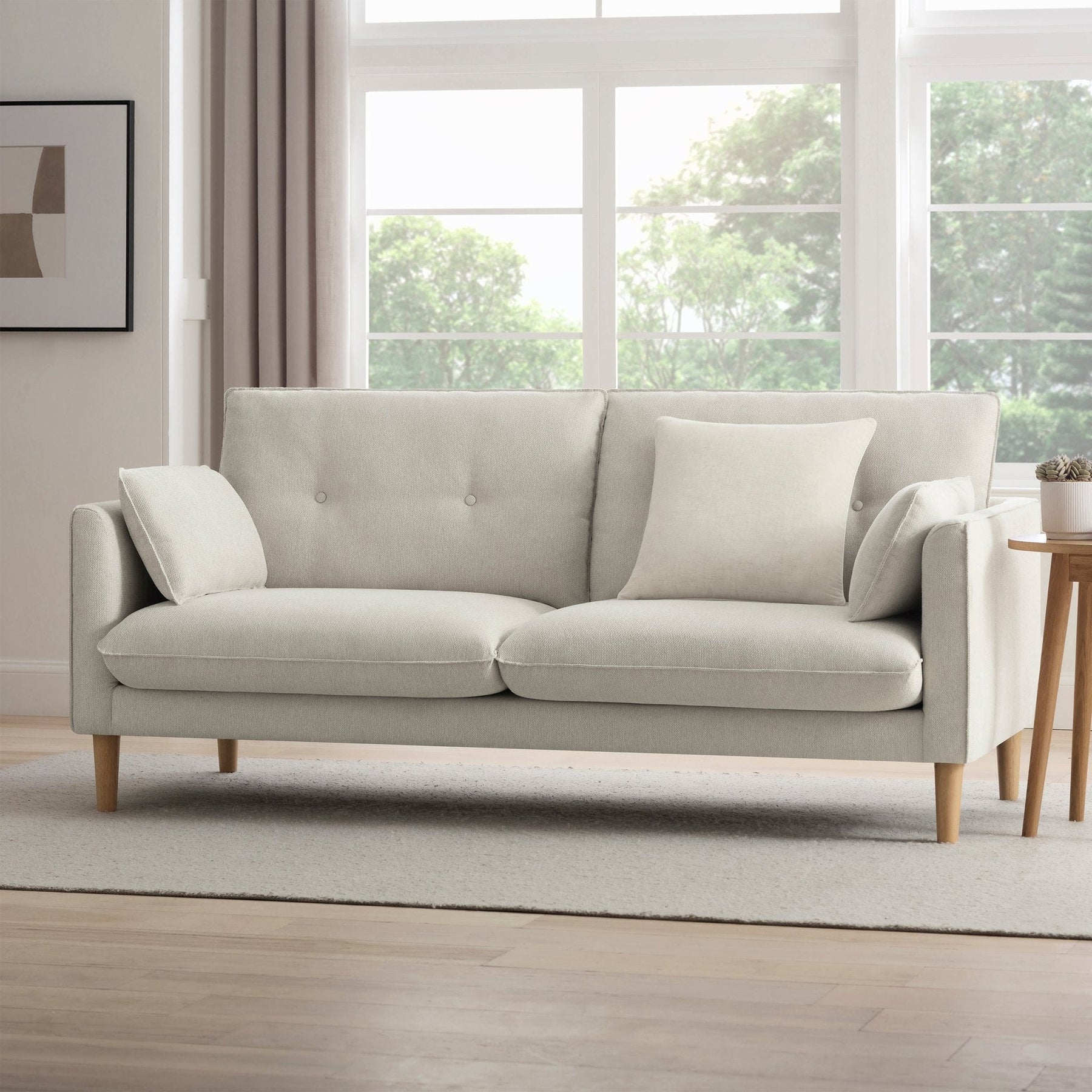 Beautifully made with soft-to-the-touch woven fabric in a subtle natural shade, the Shoreditch 3-seater sofa will blend seamlessly with any classic or contemporary interior. With its button-back design, sleek, stylish lines, and wooden legs, this sofa creates a stunning look and feel, whilst pocket-sprung seats ensure irresistible comfort and lasting durability.